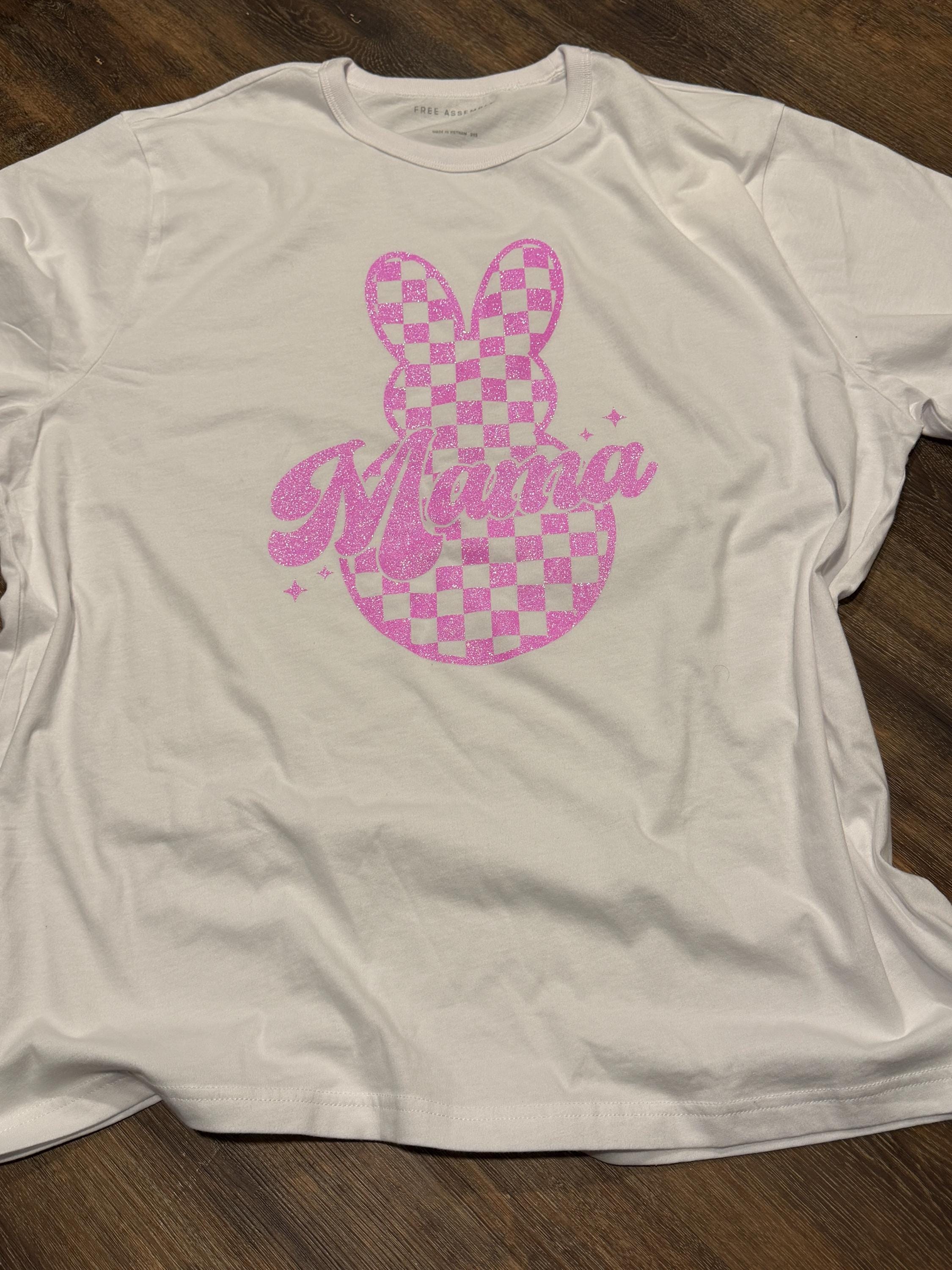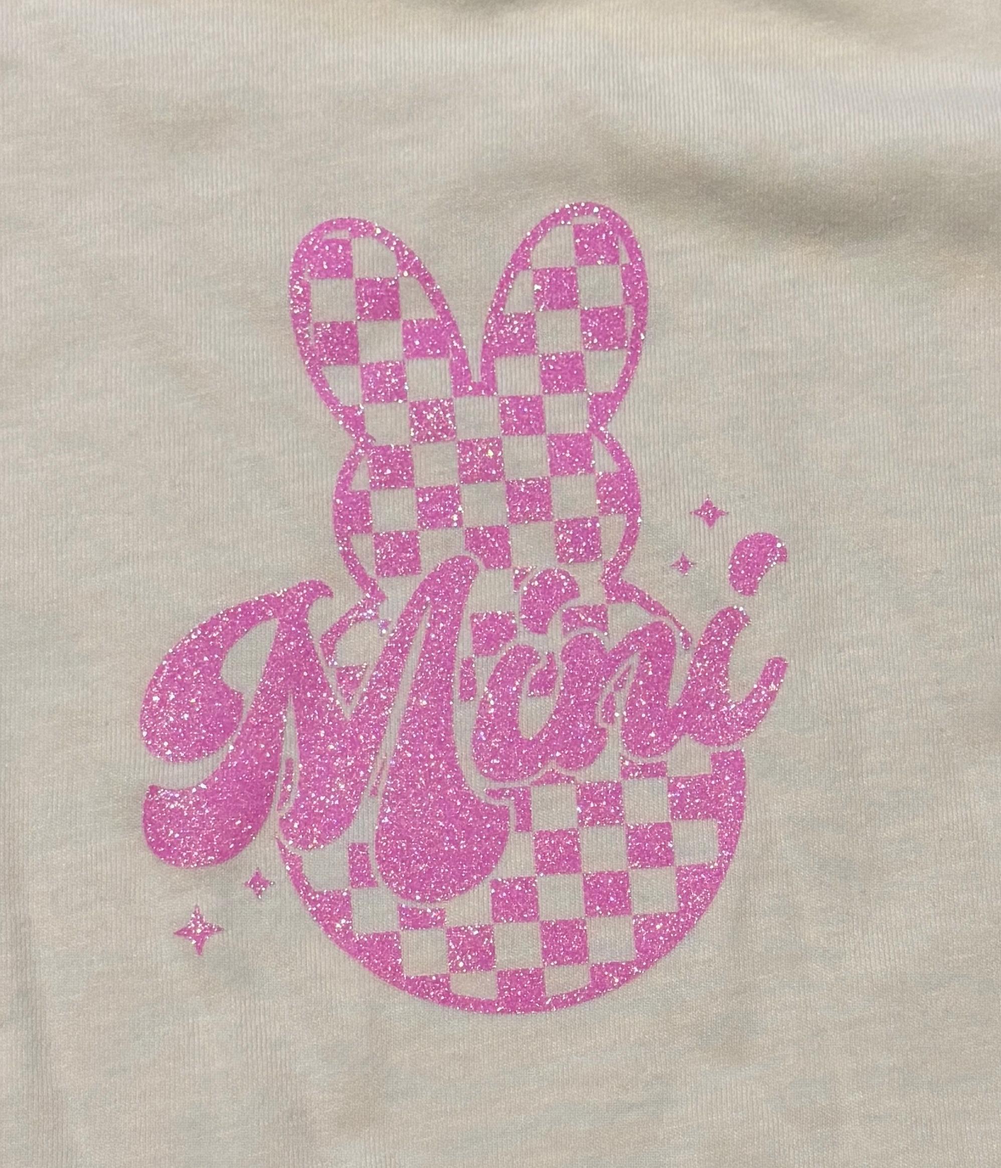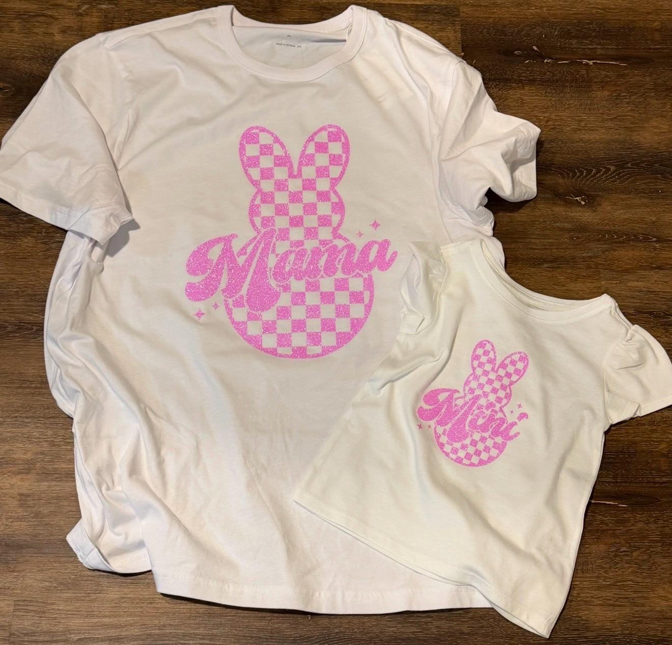 This sweet set features a pink checkered bunny design with sparkly Mama & Mini lettering, making it perfect for Easter celebrations, egg hunts, spring photos, or matching mommy-and-me outfits.