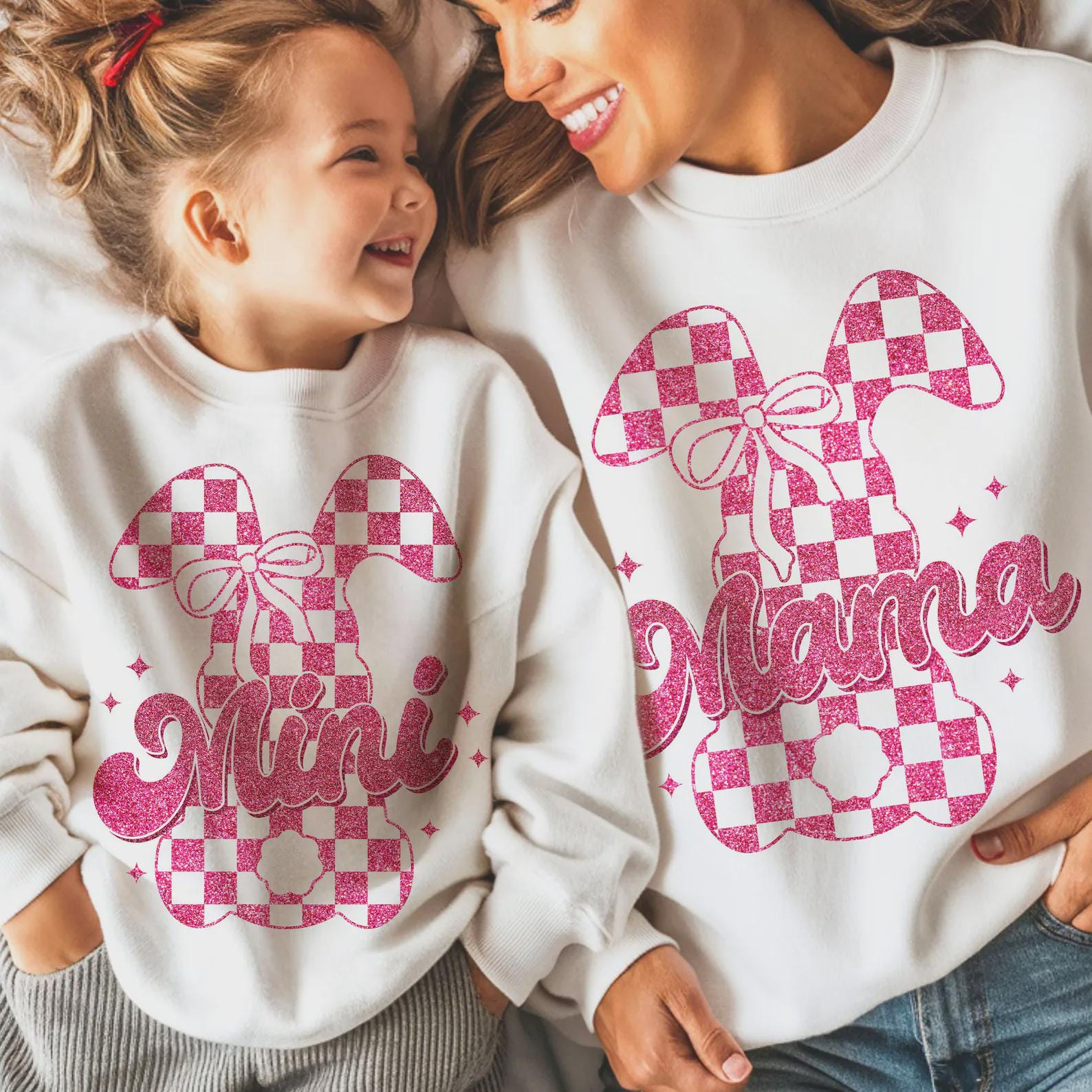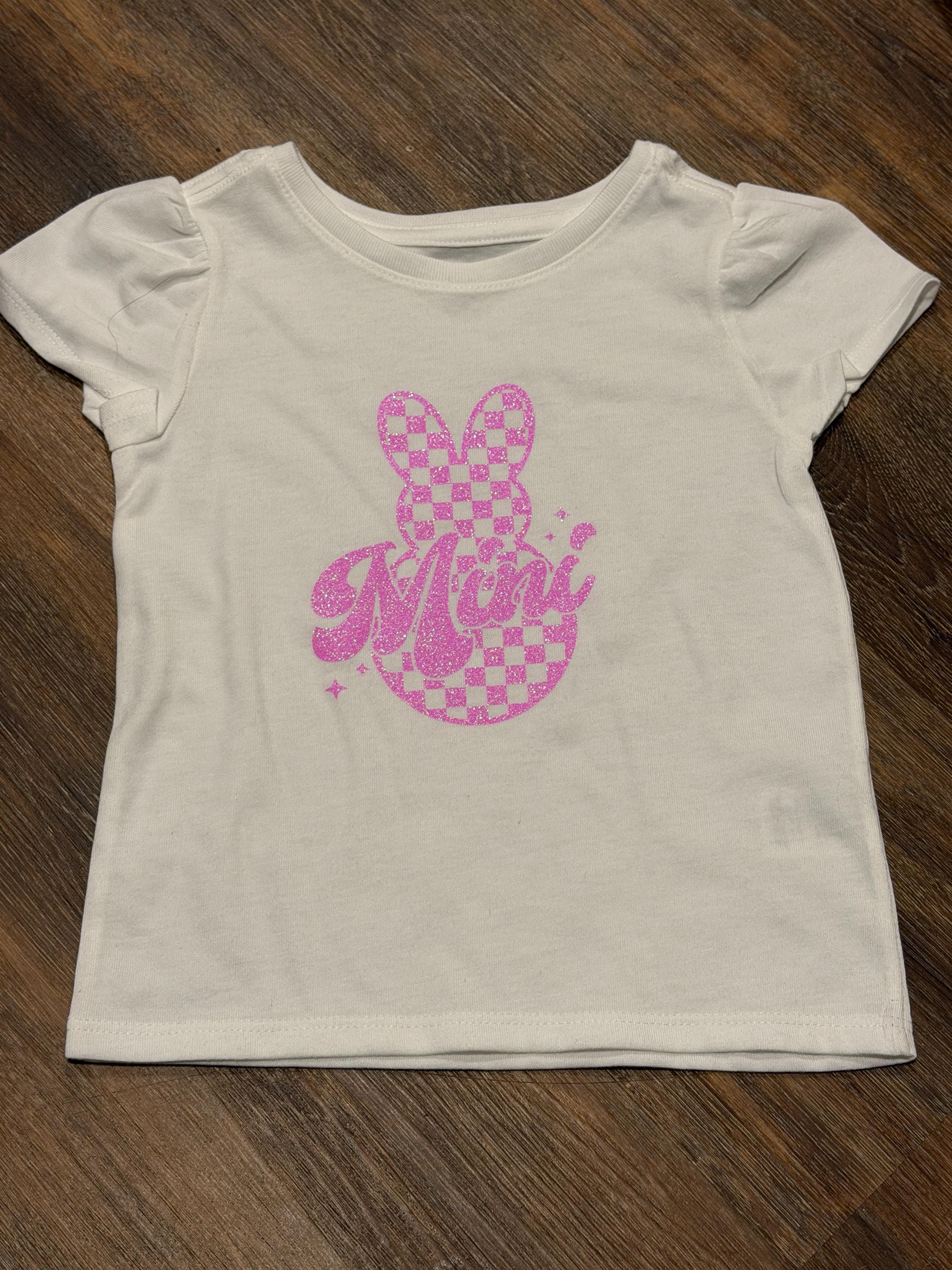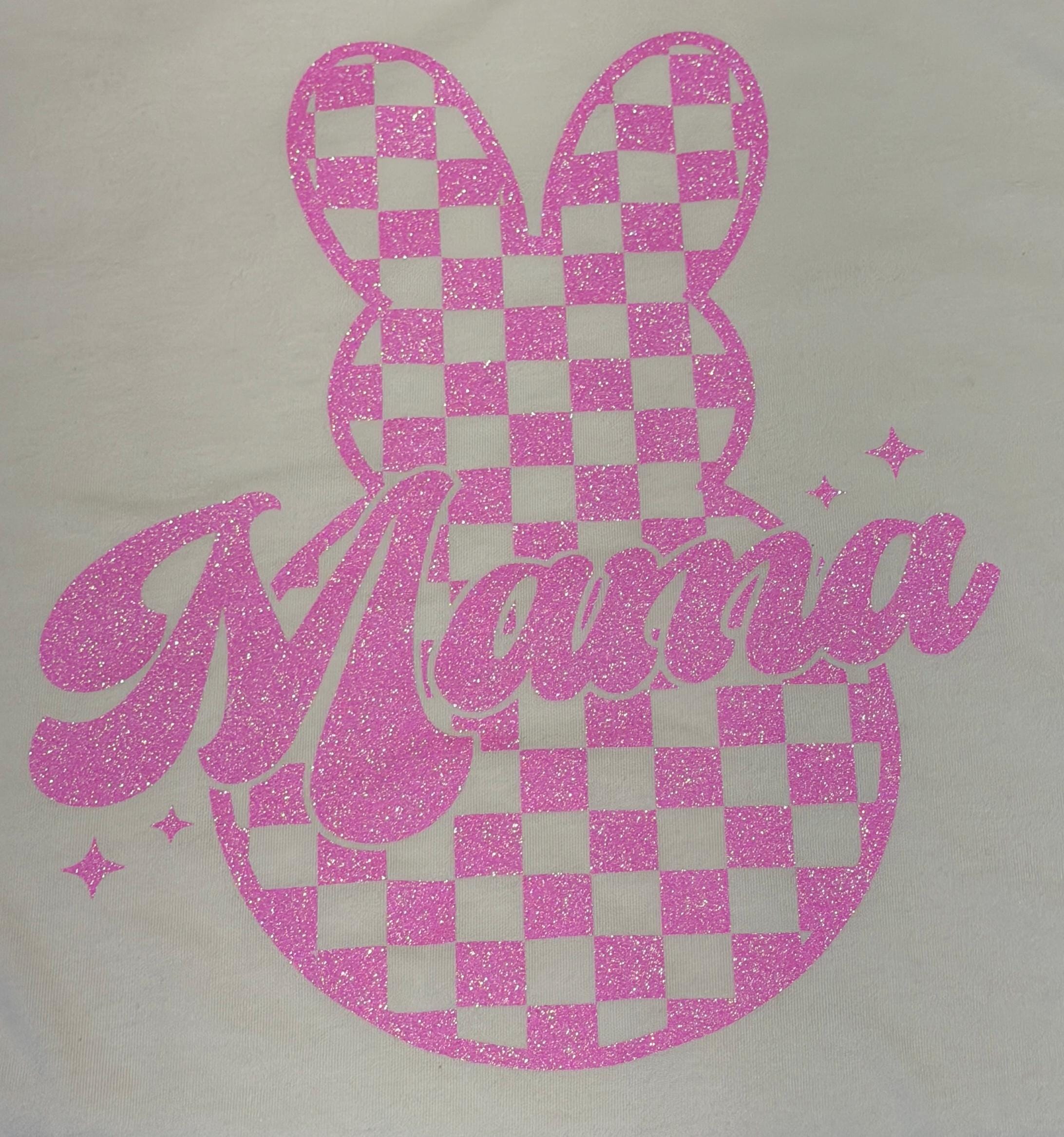 This sweet set features a pink checkered bunny design with sparkly Mama & Mini lettering, making it perfect for Easter celebrations, egg hunts, spring photos, or matching mommy-and-me outfits.